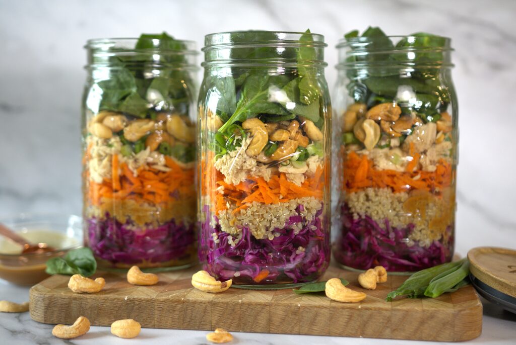 This Salmon Quinoa Crunch Salad in a mason jar is a perfect make-ahead meal, layered with cabbage, carrots, spinach, quinoa, and roasted salmon, then topped with cashews and a creamy miso peanut dressing. Packed with flavor, protein, and crunch, it’s an easy and nutritious grab-and-go lunch for busy weeks.