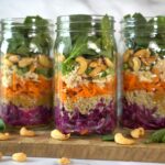 - Top the cabbage in each jar with 1/2 cup quinoa. Then 2 tbsp of miso peanut dressing.