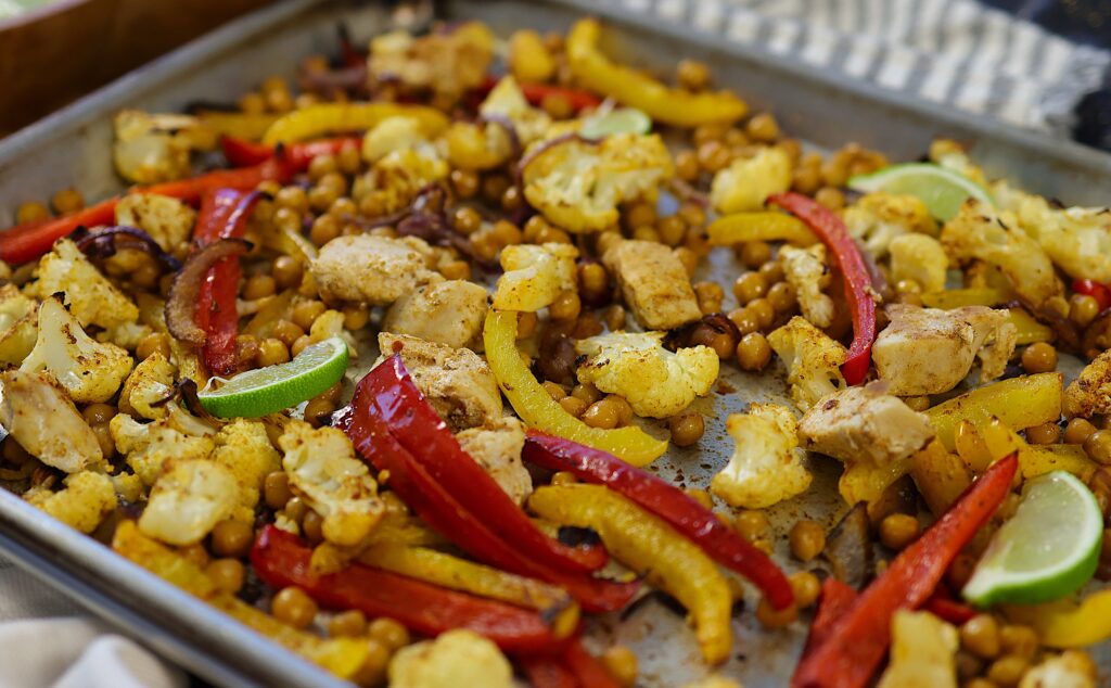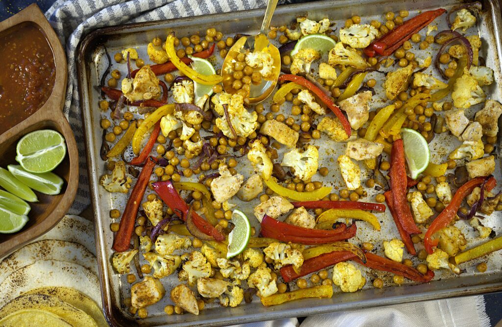These easy sheet pan fajitas are loaded with colorful bell peppers, onions, chickpeas, and cauliflower—with an optional chicken add-on for a flexitarian twist. Perfect for busy weeknights or meal prep, this veggie-packed dinner is healthy, customizable, and full of bold fajita flavor.