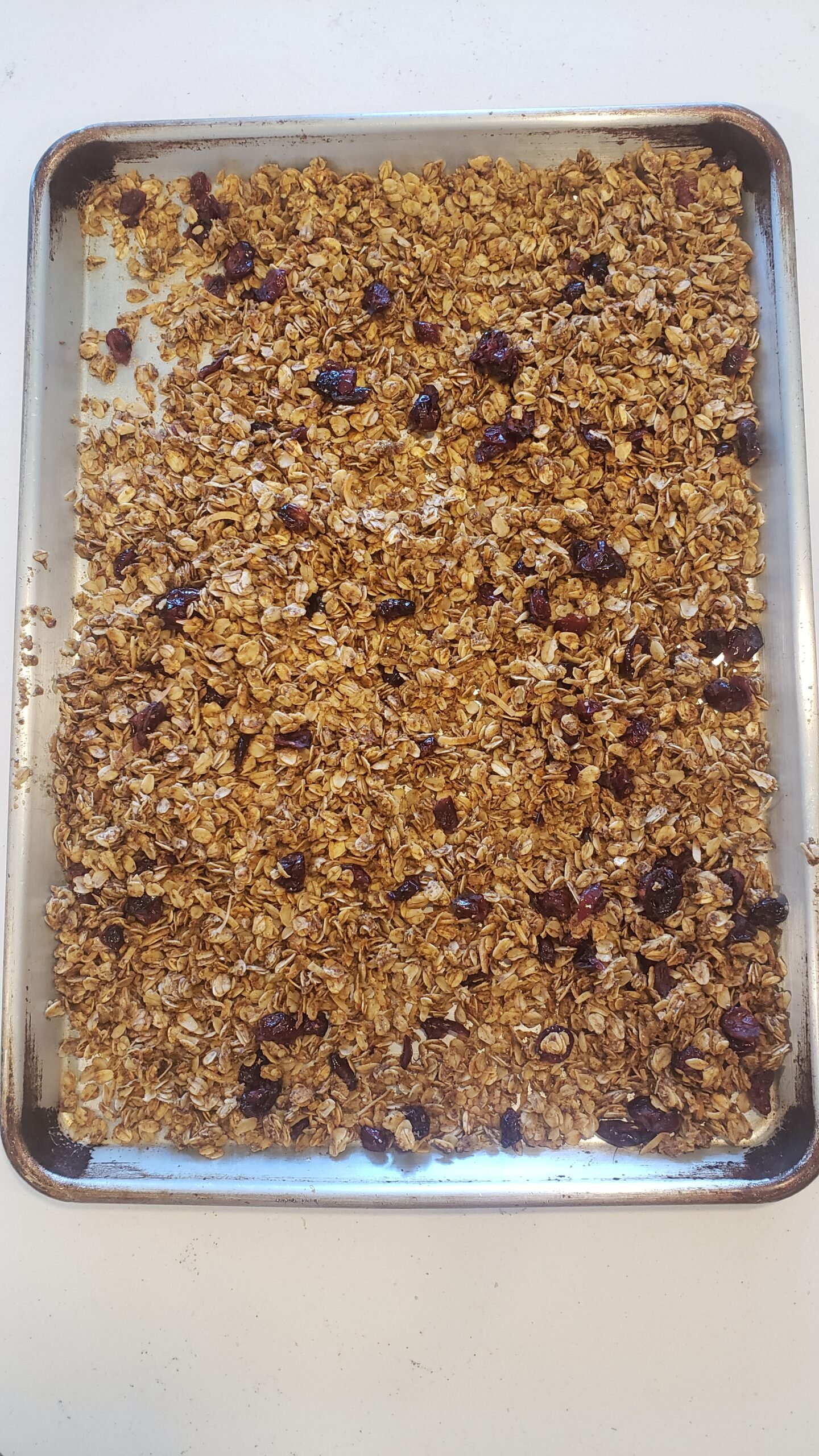 8. Now is the time to add in dried cranberries or any dried fruit. Mix into the granola and allow to cool.