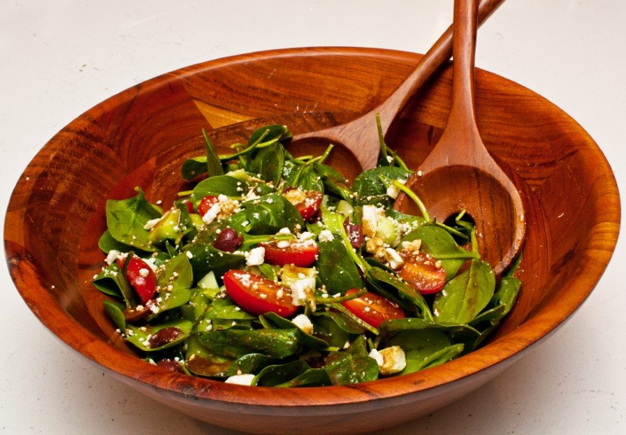 - Place the spinach into a large bowl. Add the cucumber, tomatoes, kalamata olives and feta cheese.